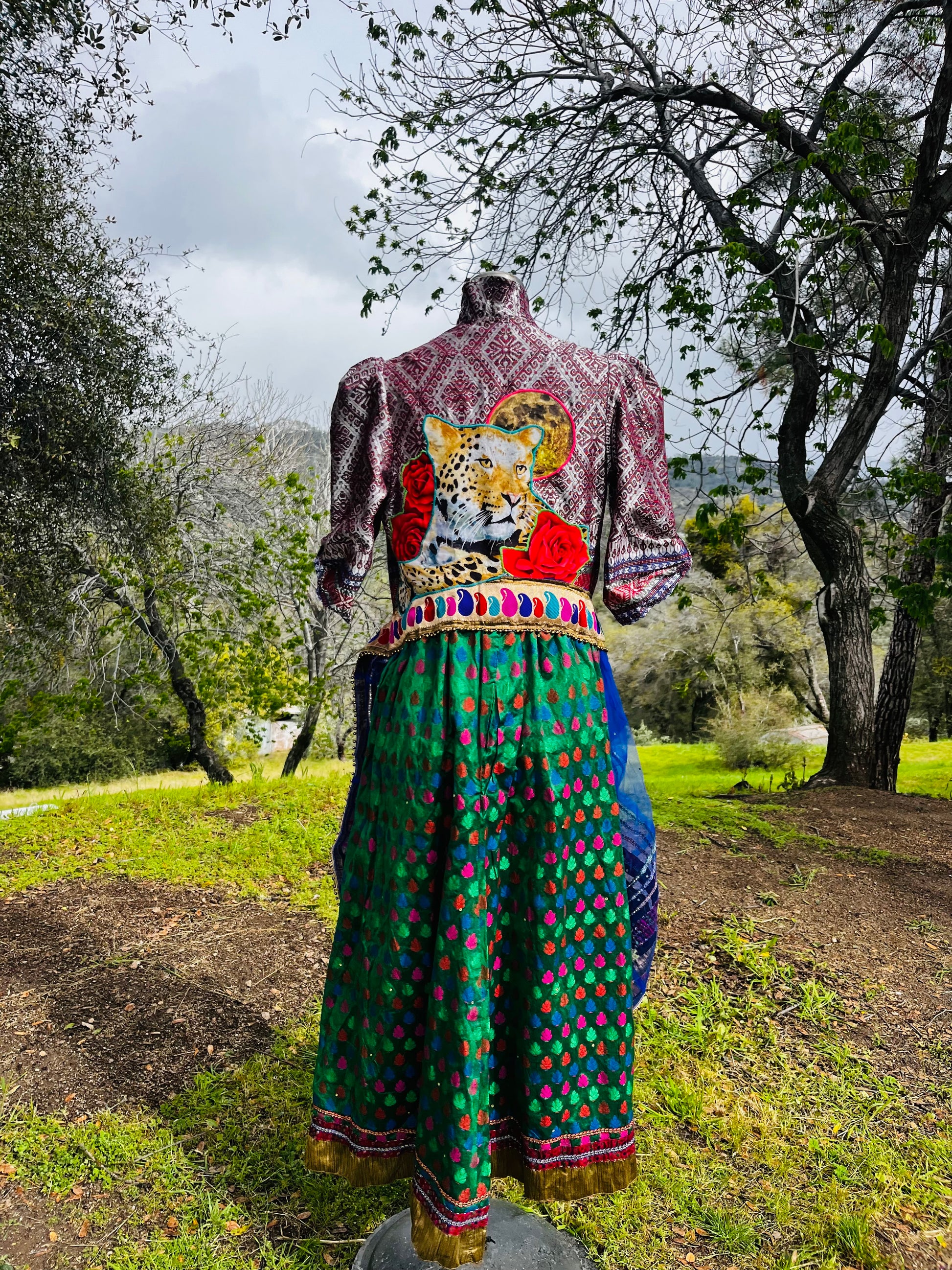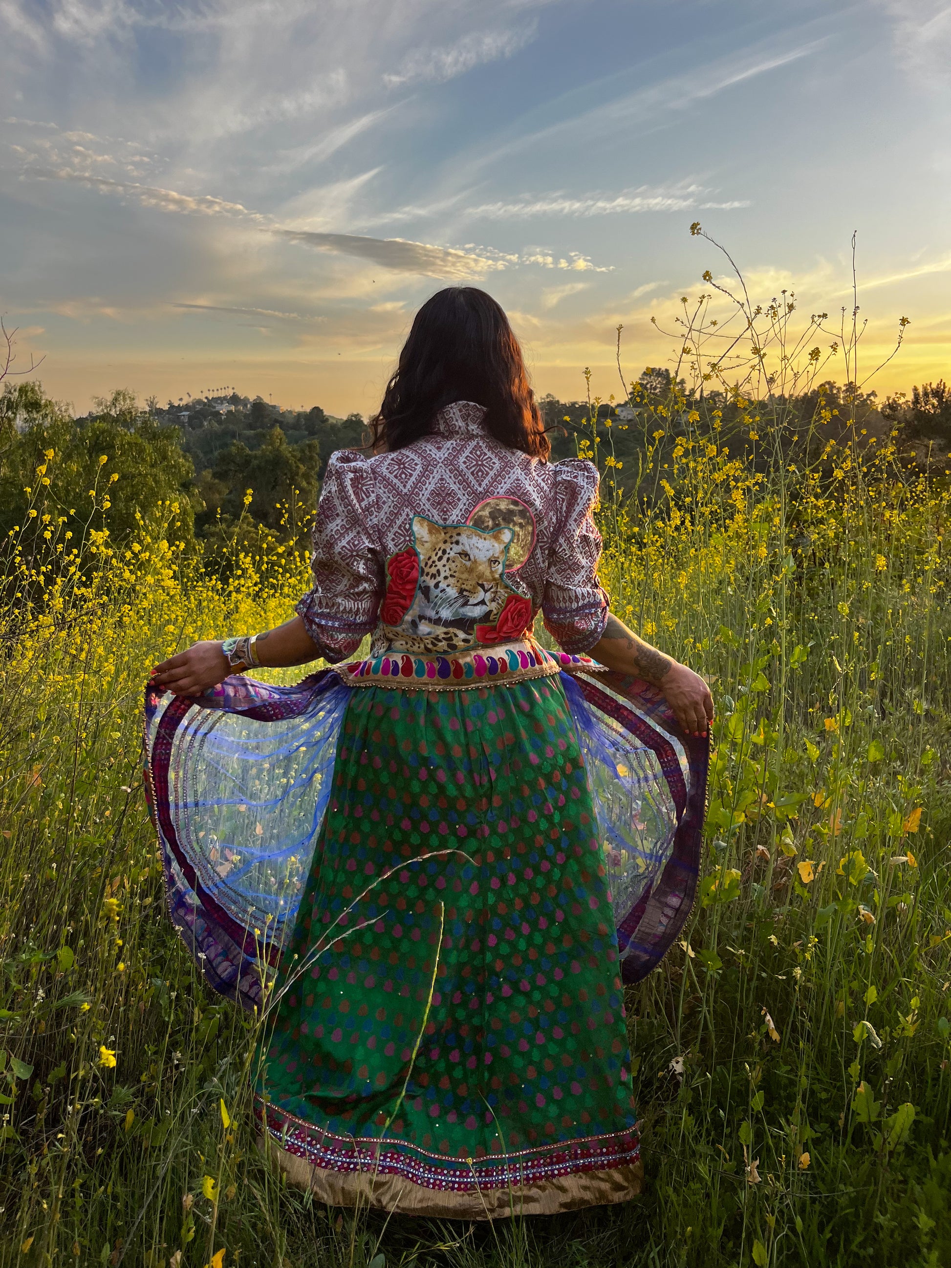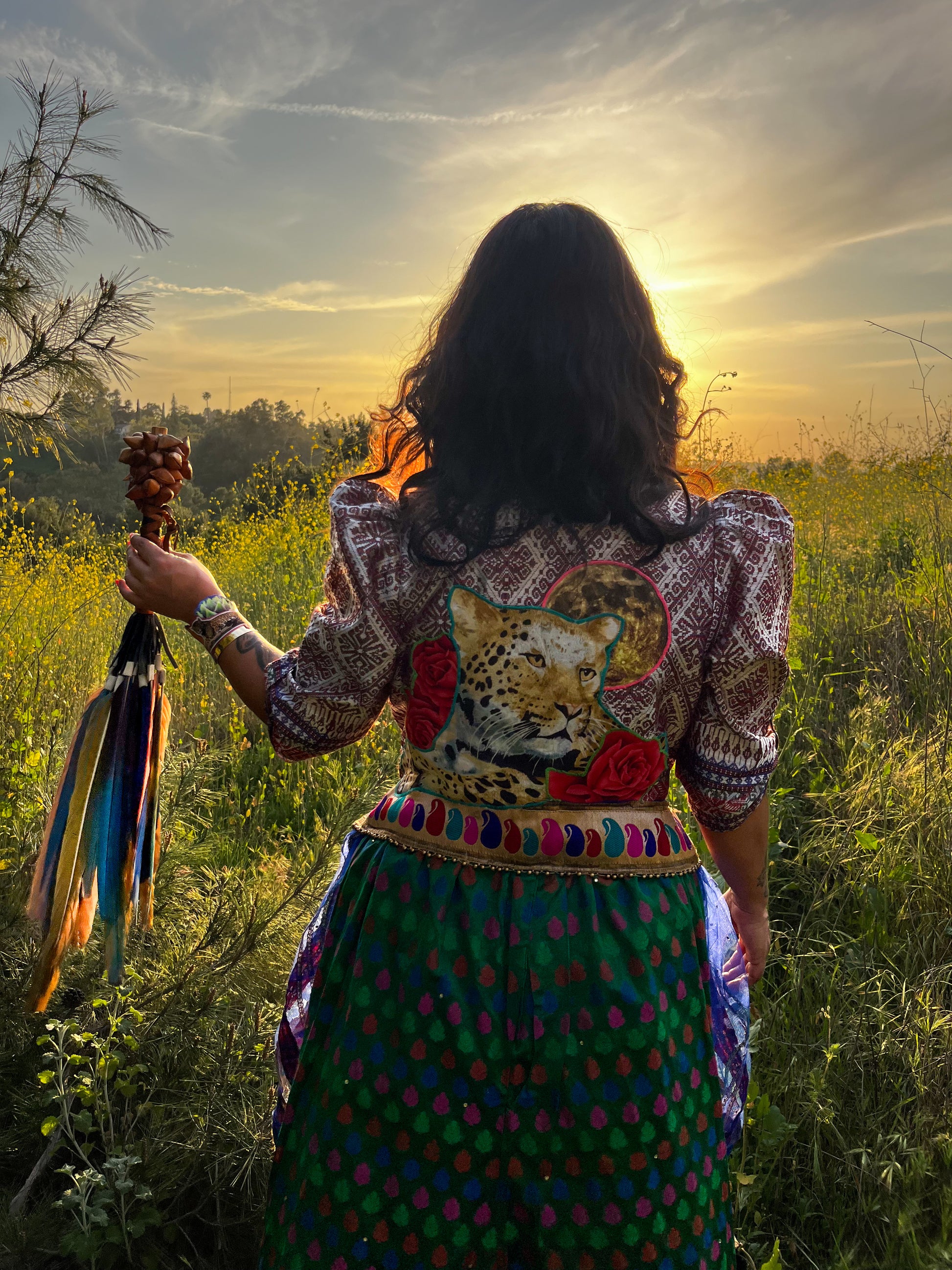 The magic begins with finding fabrics that are recycled. This piece is made from Indian textile and a recycled textile. Female jaguars, roses and moon are all textiles that are hand cut and embroidered. Each piece is made with time and intention. May it connect, empower you and others when wearing your piece.