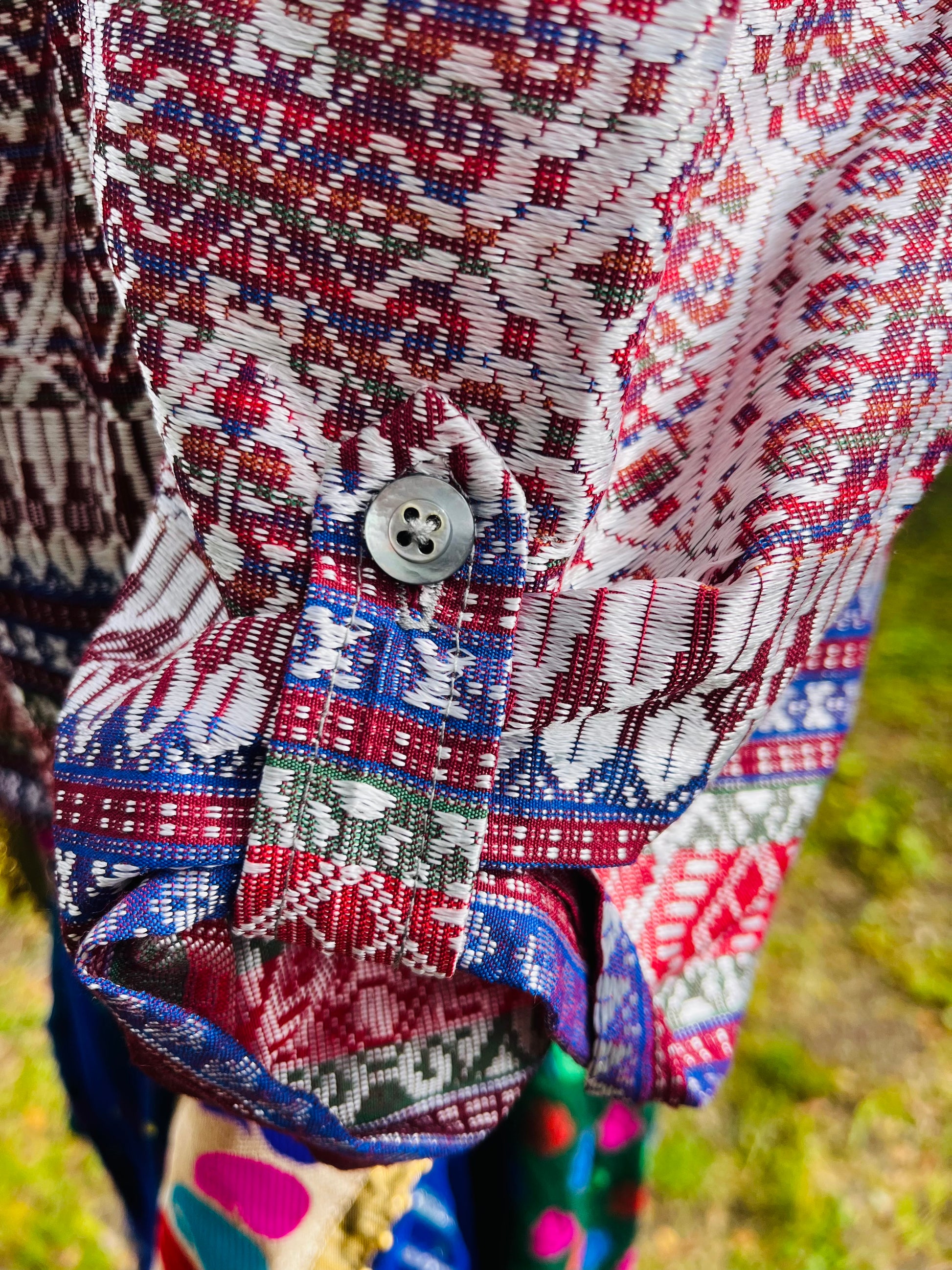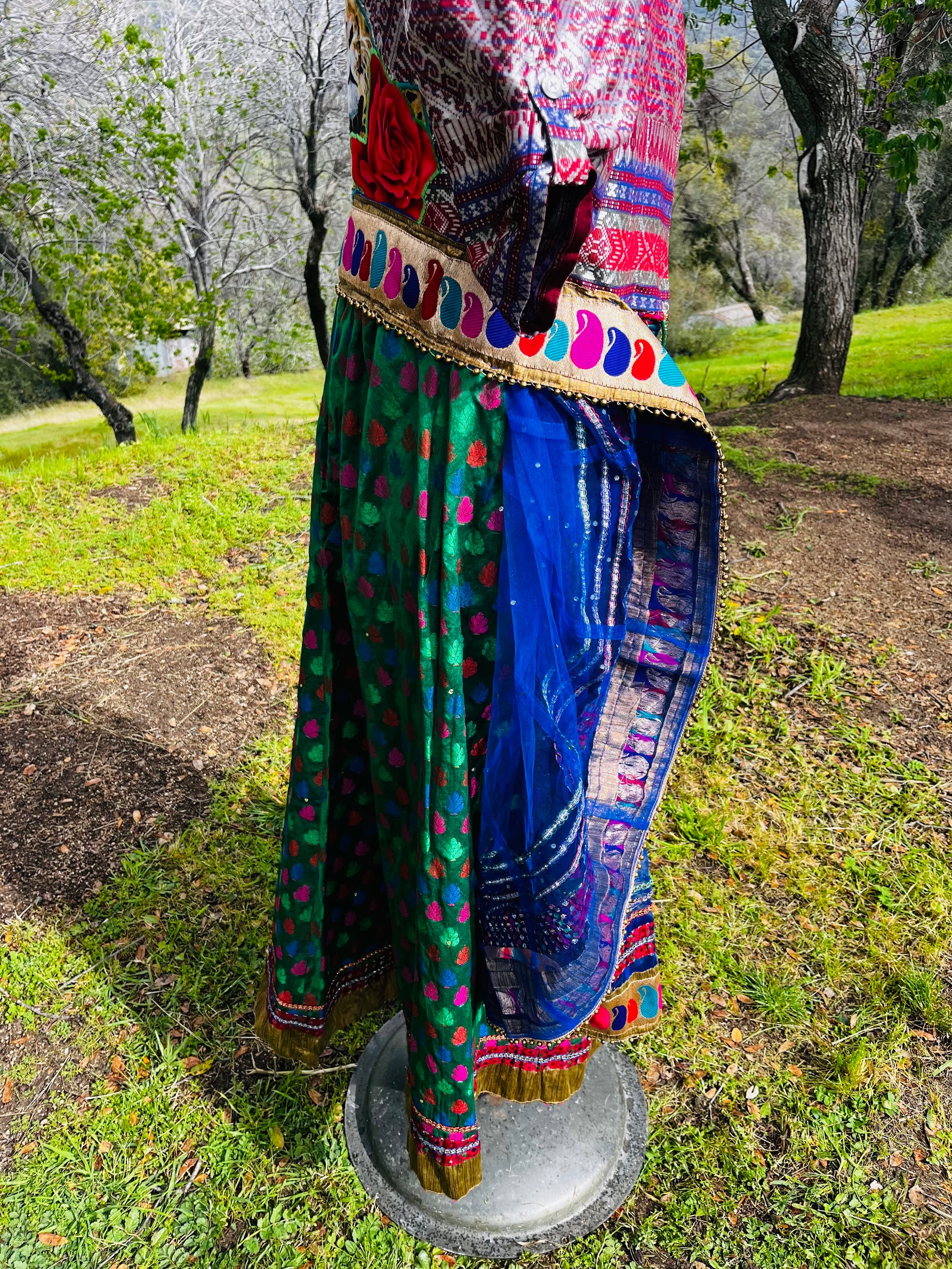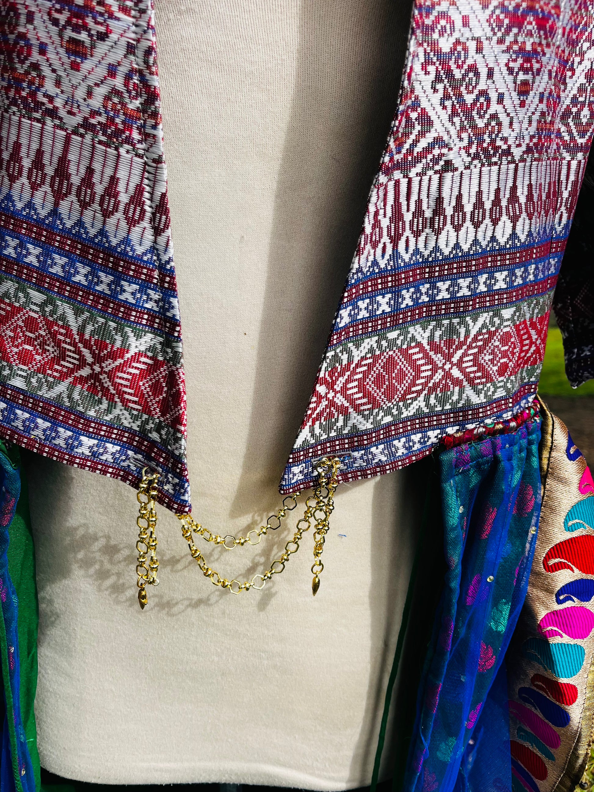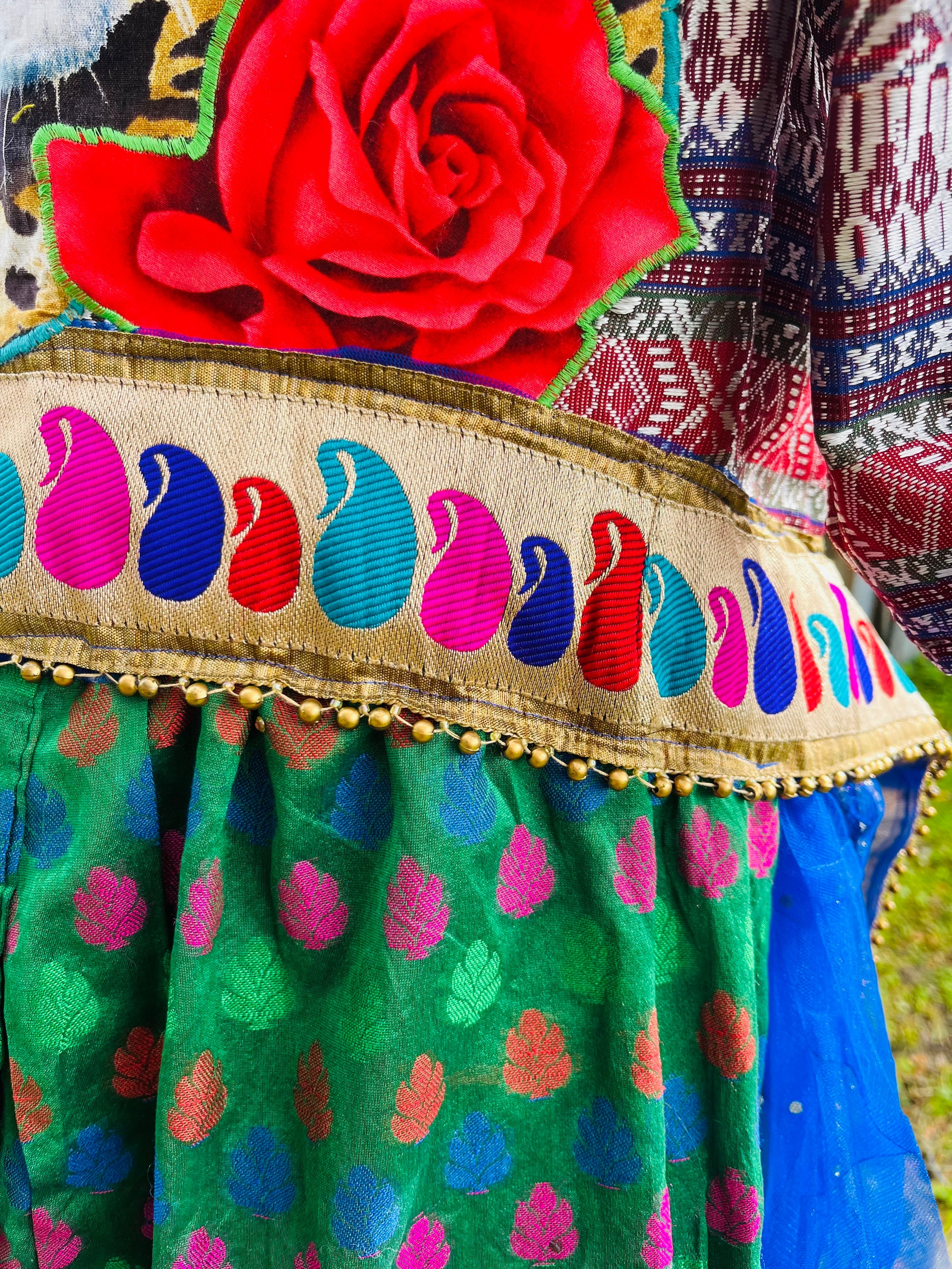 The magic begins with finding fabrics that are recycled. This piece is made from Indian textile and a recycled textile. Female jaguars, roses and moon are all textiles that are hand cut and embroidered. Each piece is made with time and intention. May it connect, empower you and others when wearing your piece.