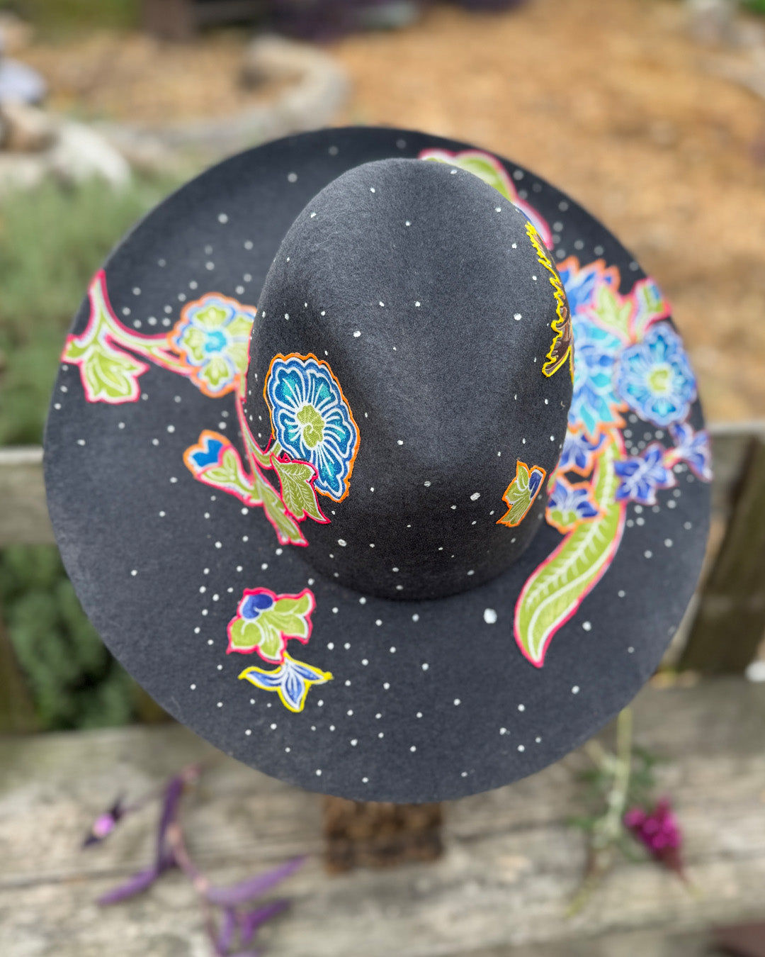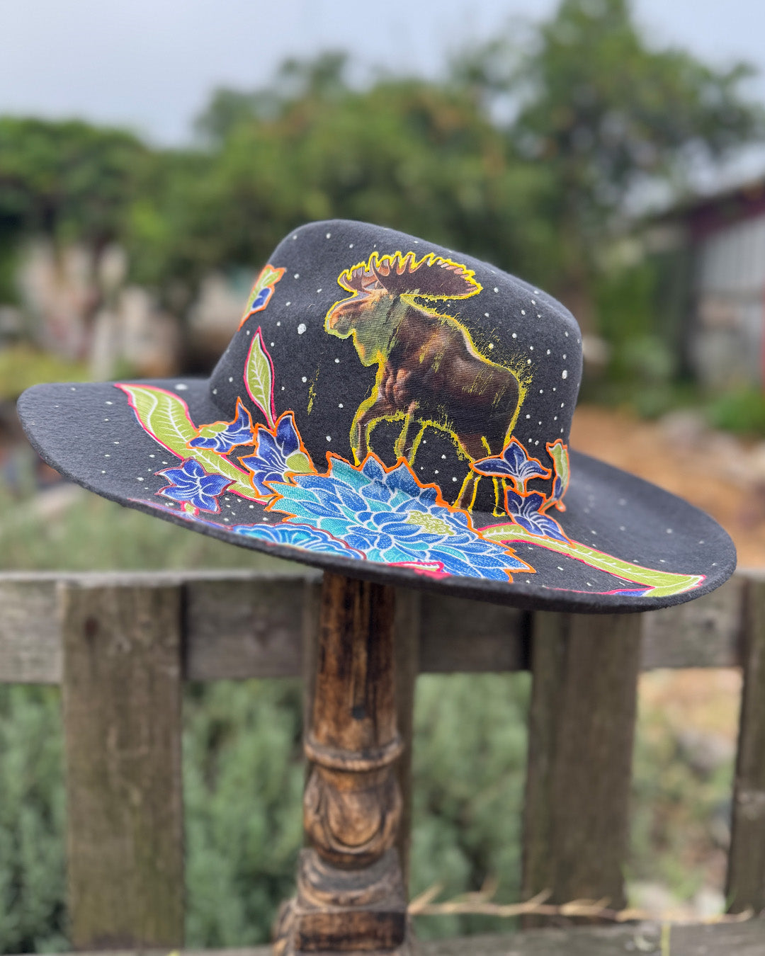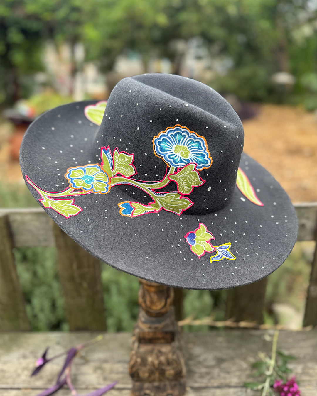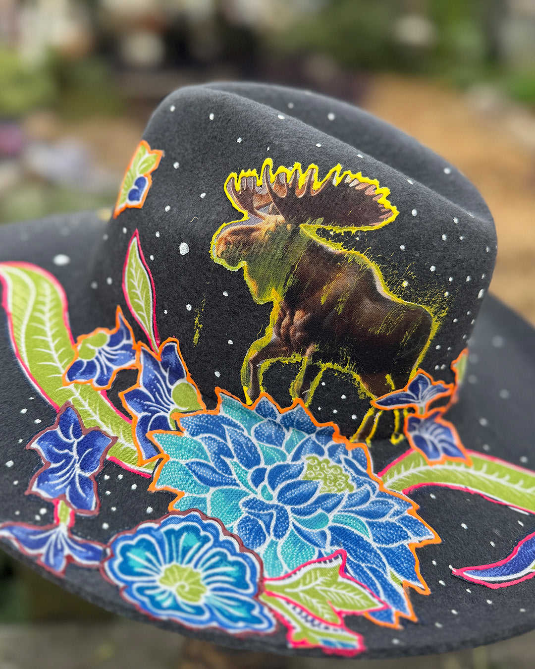 How it is Made: Fabric finds are hand-cut and layered before being pressed onto the hat. Painted details are added to create dimension.
