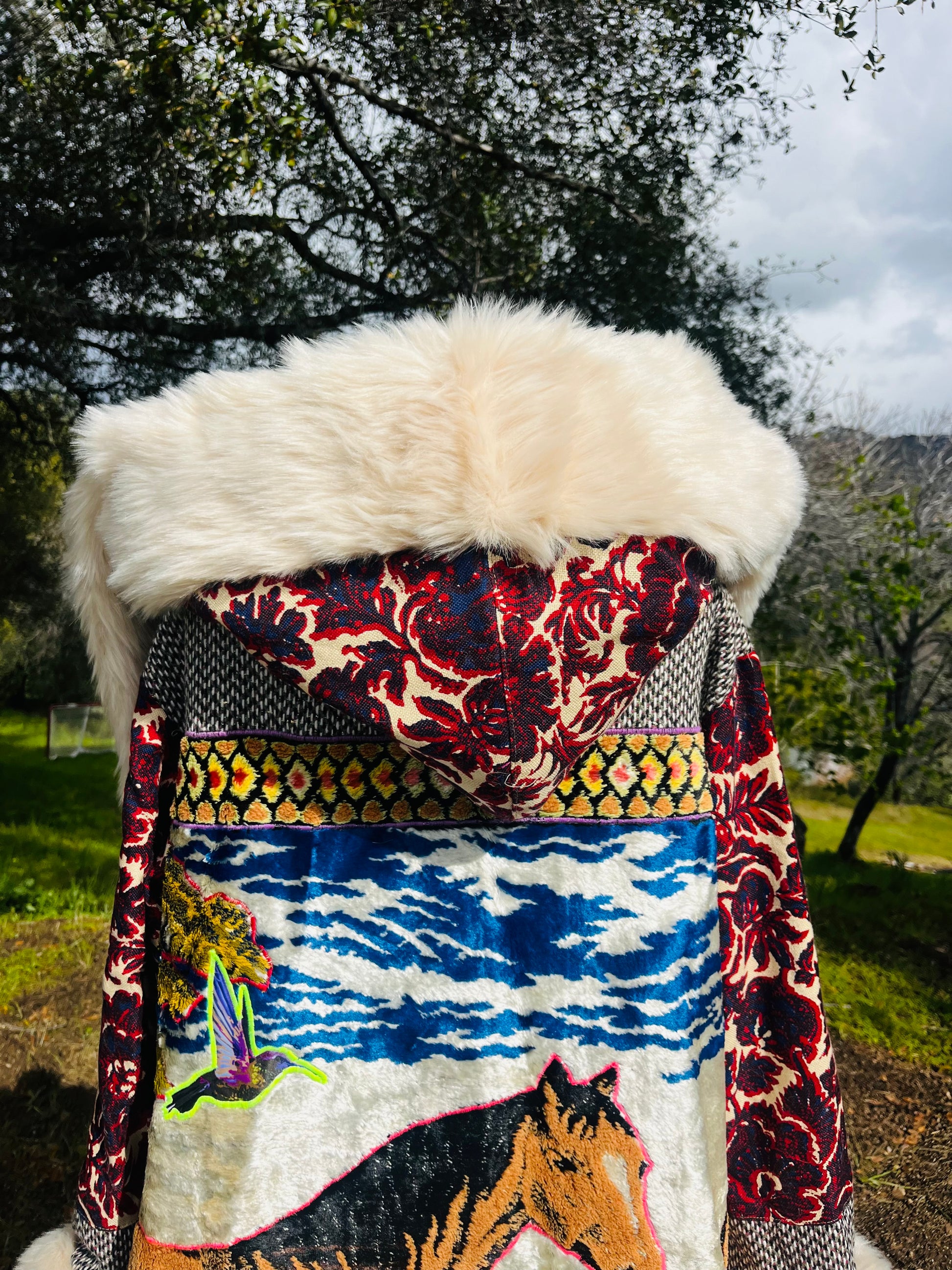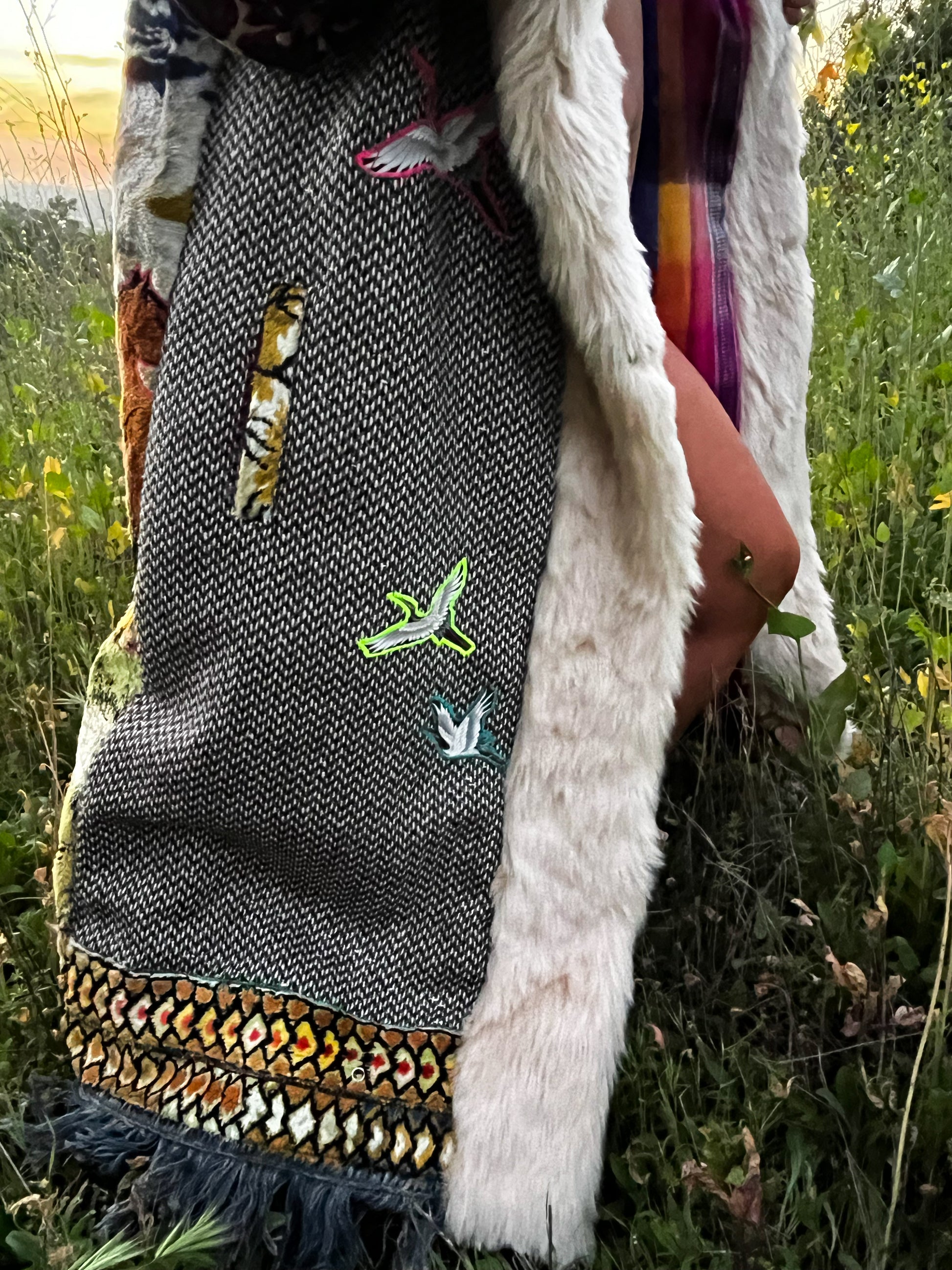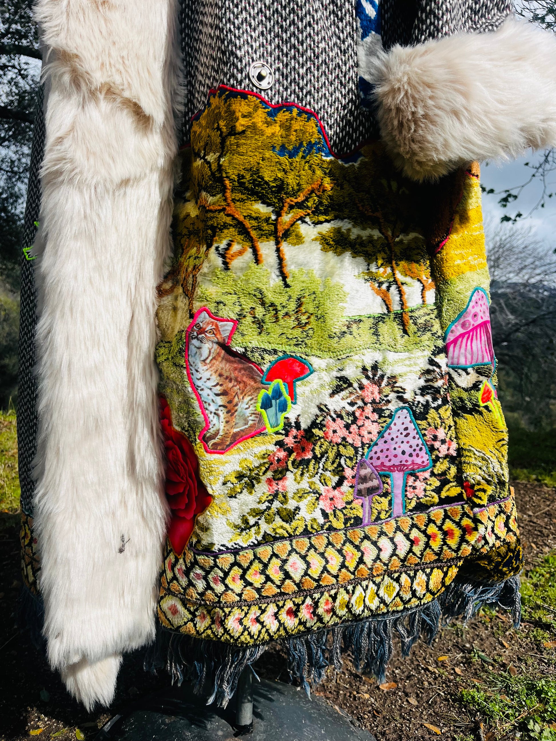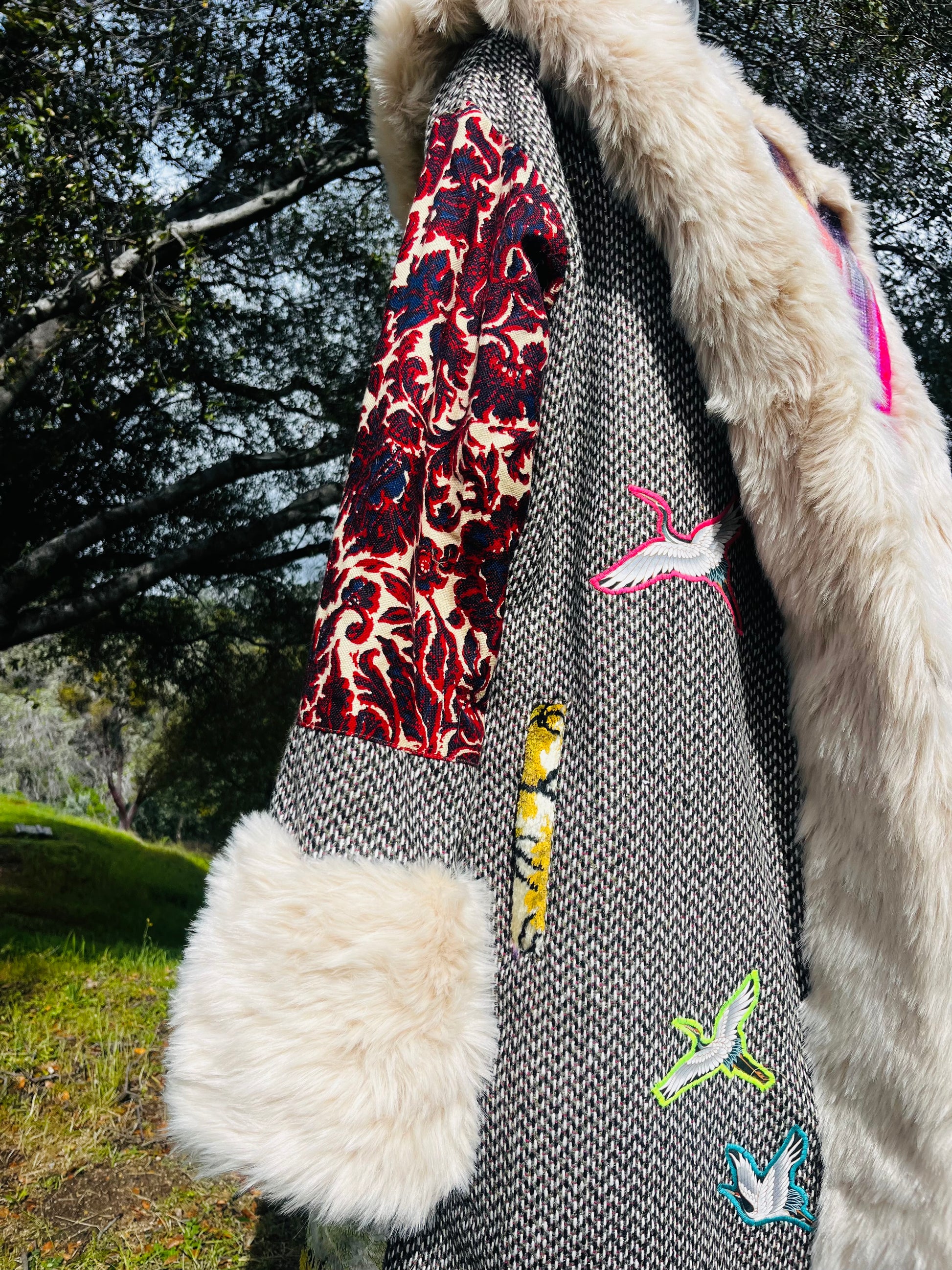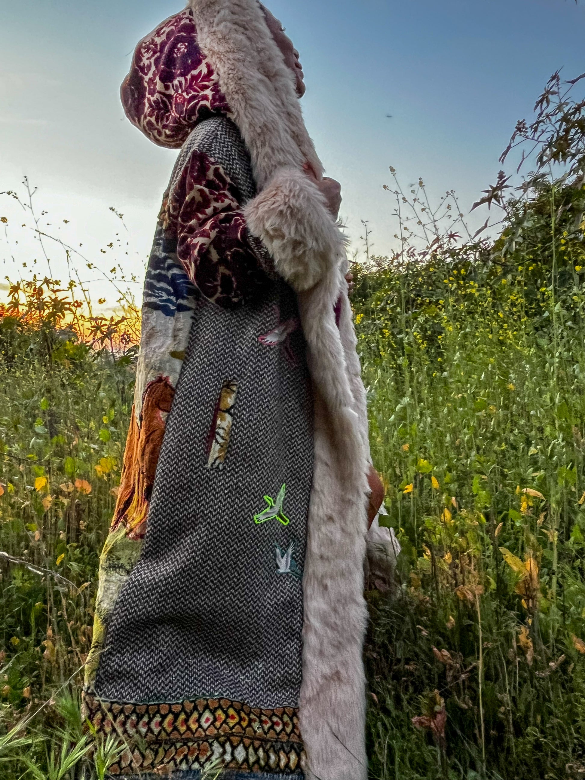 How it’s made The magic begins with finding fabrics that are recycled. This piece is made from dead stock wool from Italy, 1970s wall tapestry, sleves and hood recycled textiles.interior alpaca, hood and trim faux fur All textiles images are hand cut and embroidered. Each piece is made with time and intention. May it serve as a remind of what you are germinating within you.