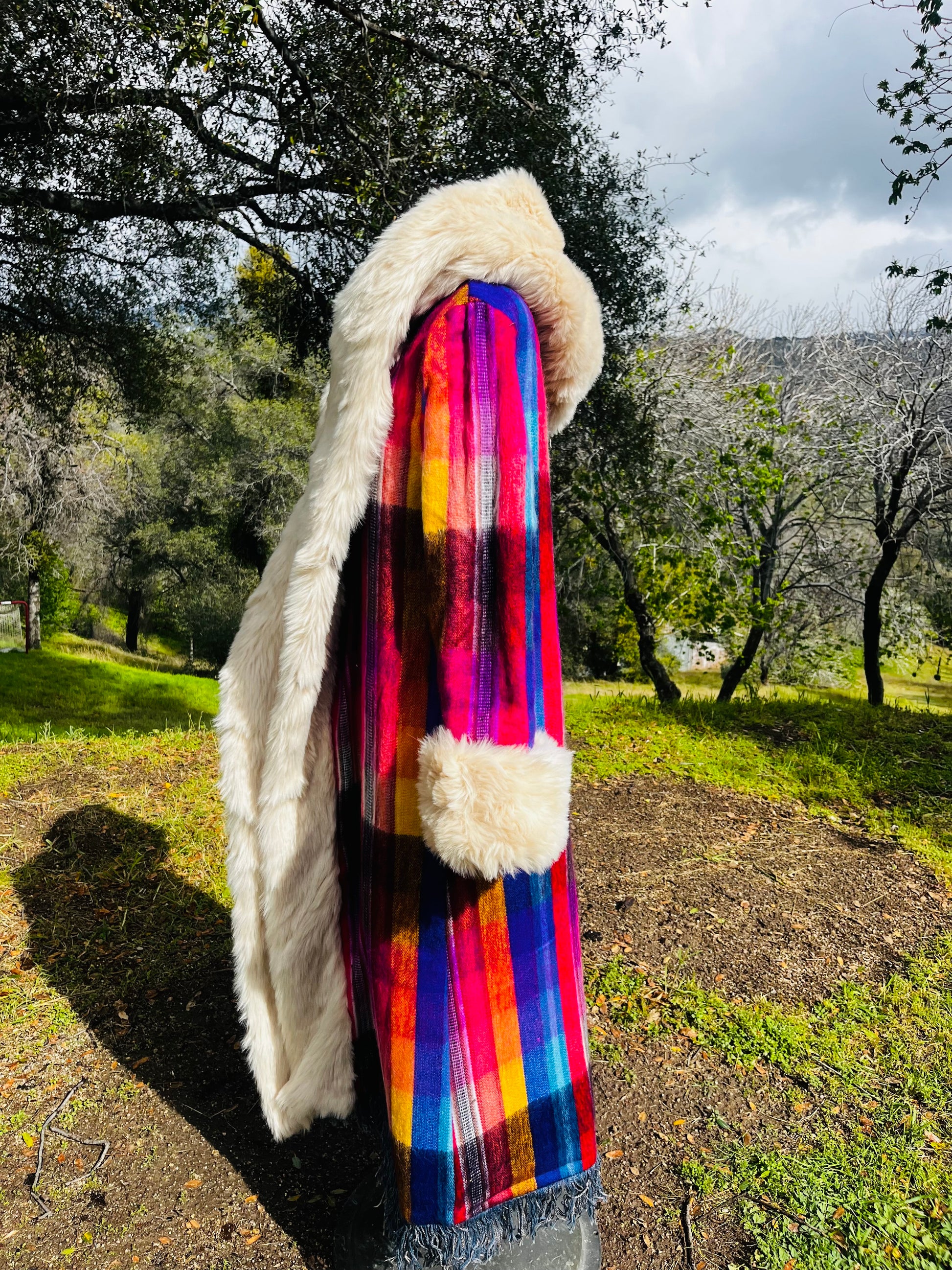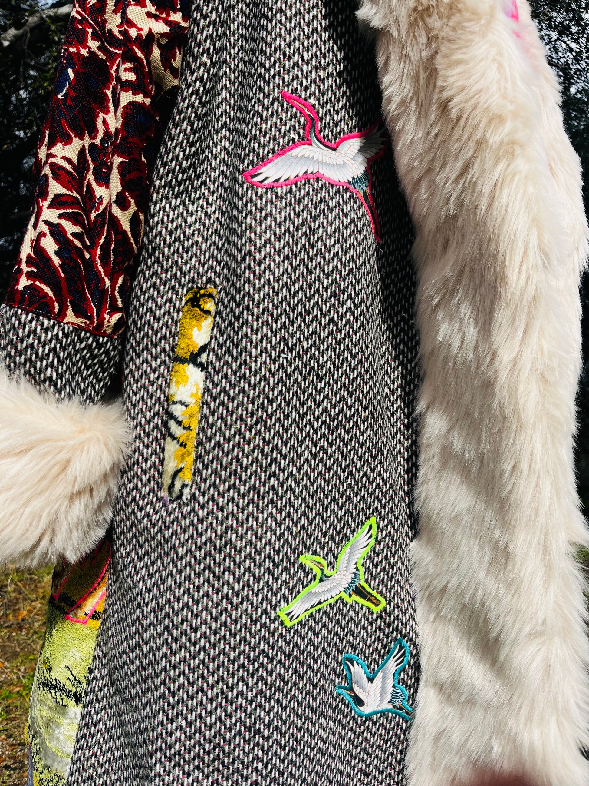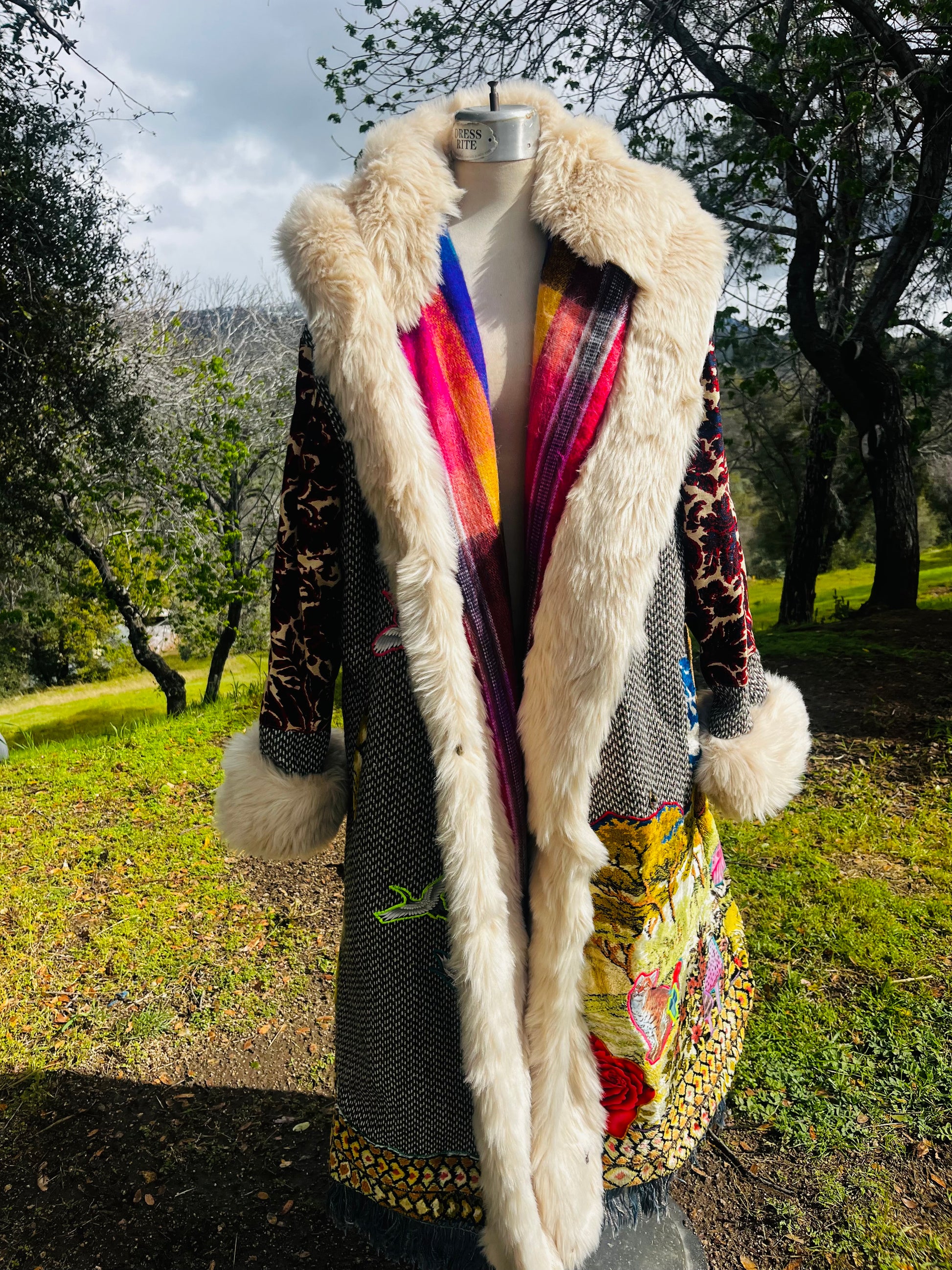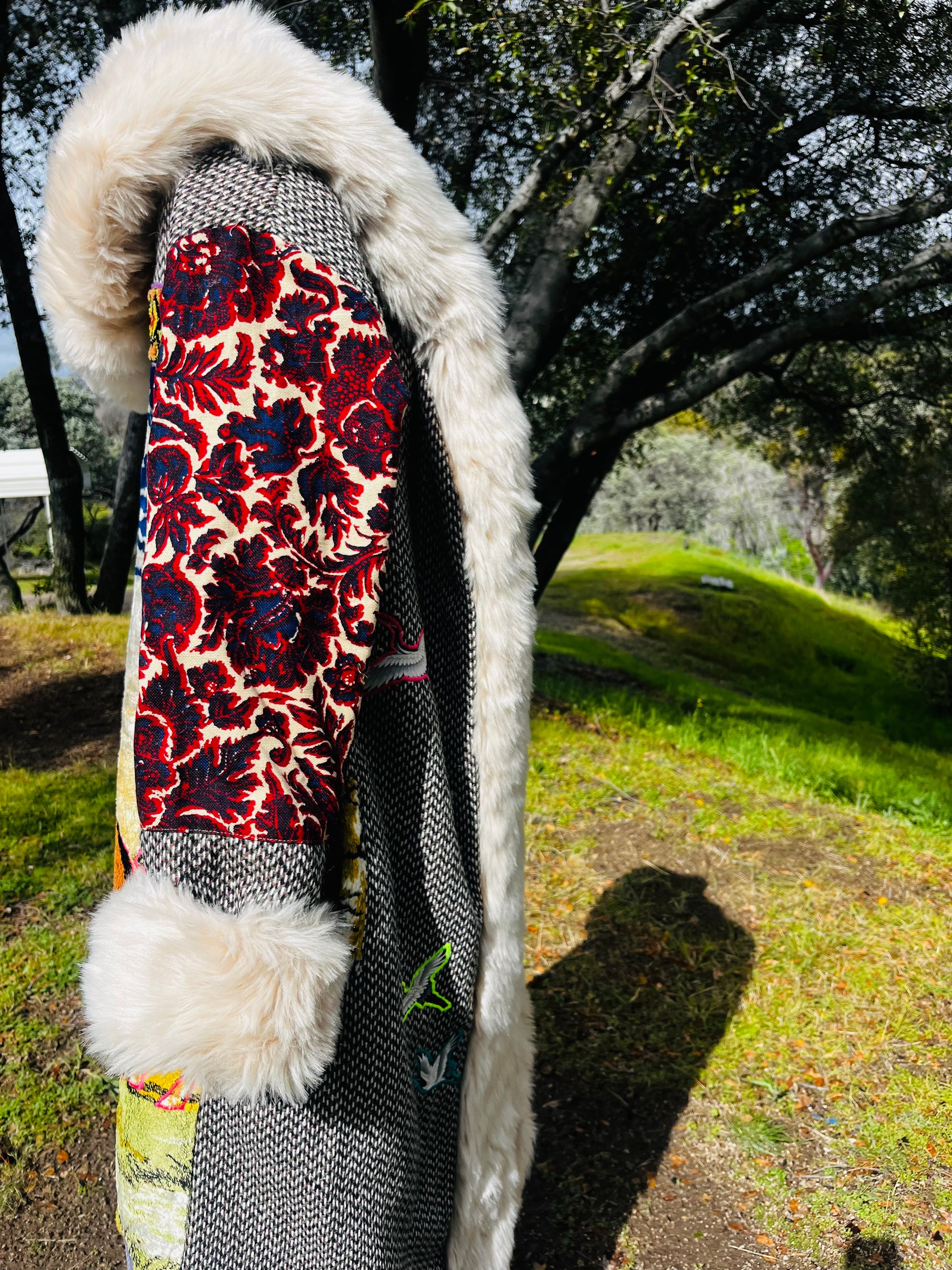 How it’s made The magic begins with finding fabrics that are recycled. This piece is made from dead stock wool from Italy, 1970s wall tapestry, sleves and hood recycled textiles.interior alpaca, hood and trim faux fur All textiles images are hand cut and embroidered. Each piece is made with time and intention. May it serve as a remind of what you are germinating within you.
