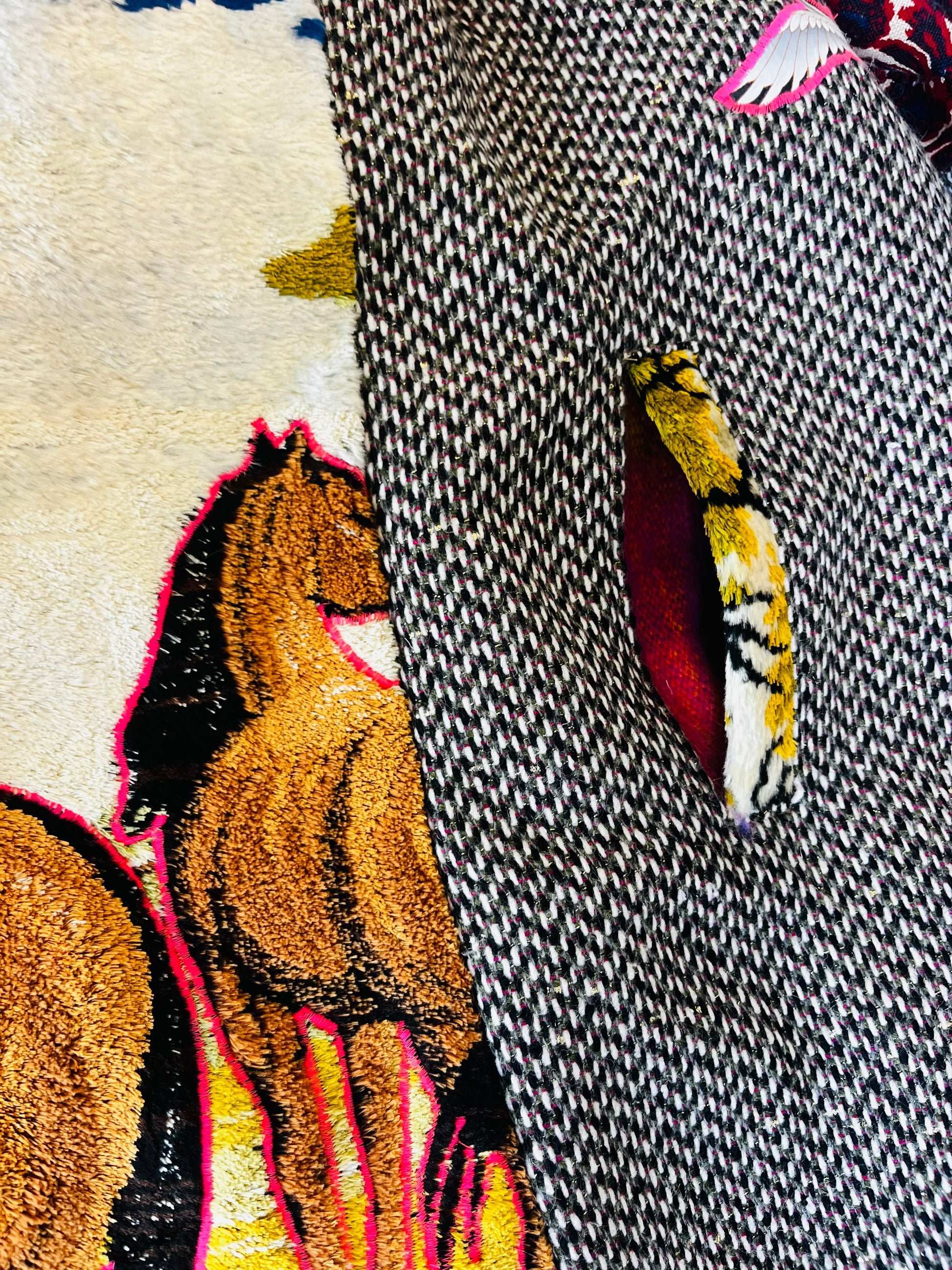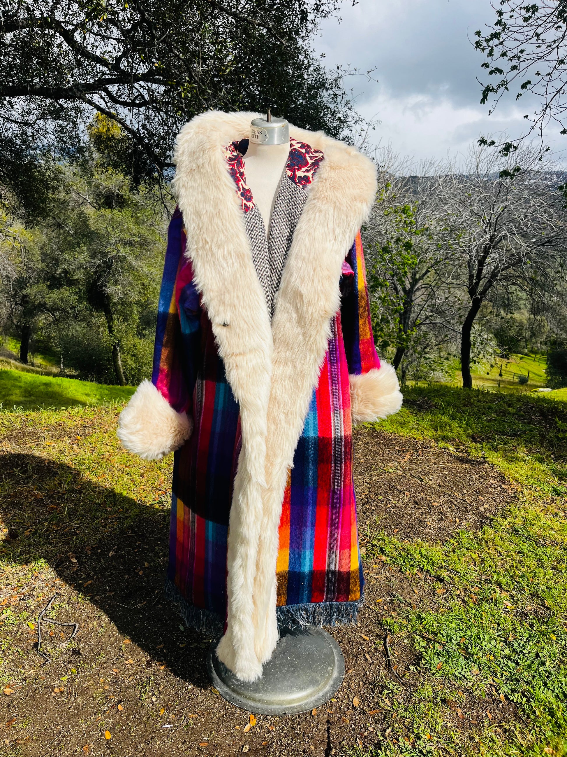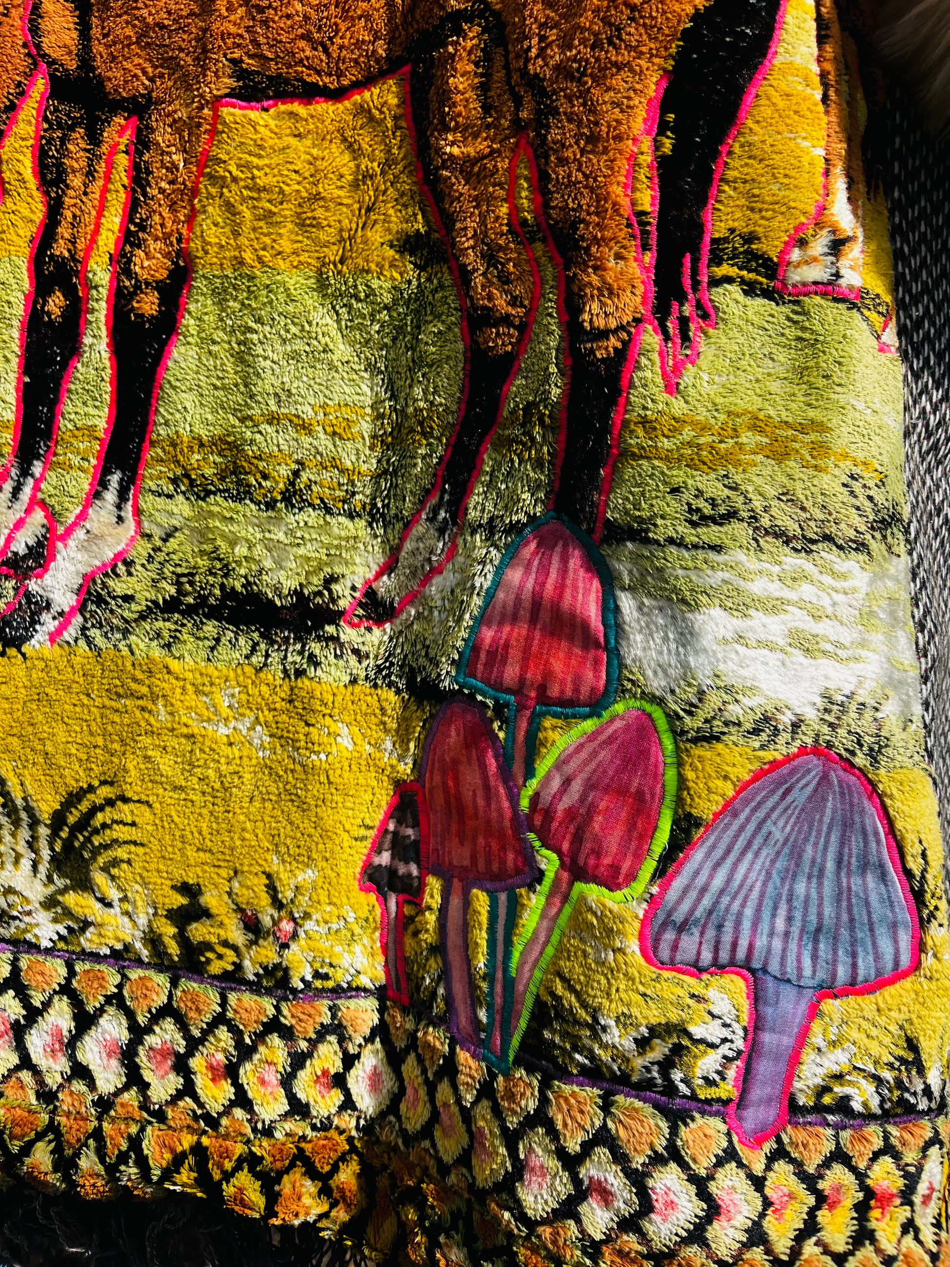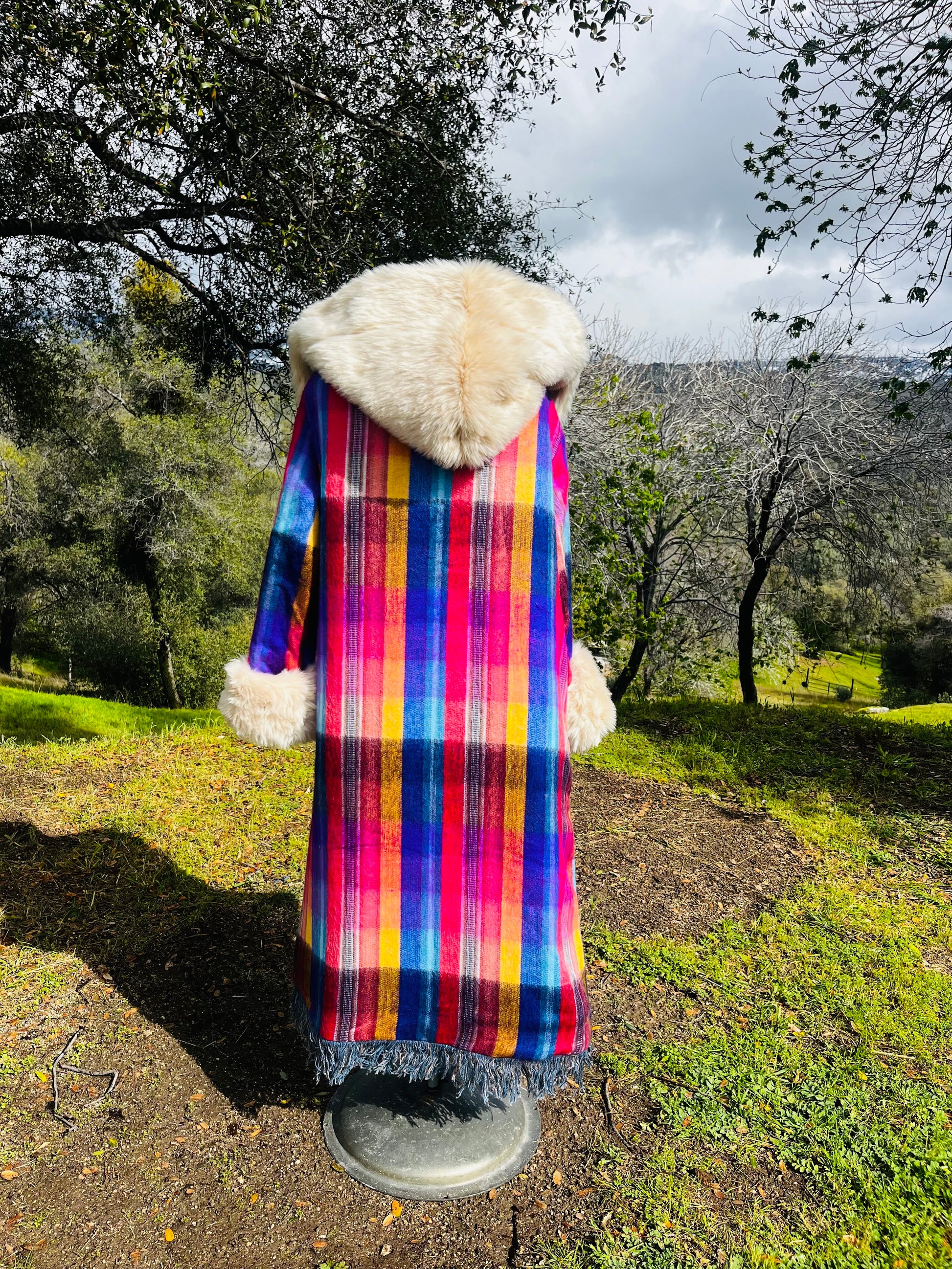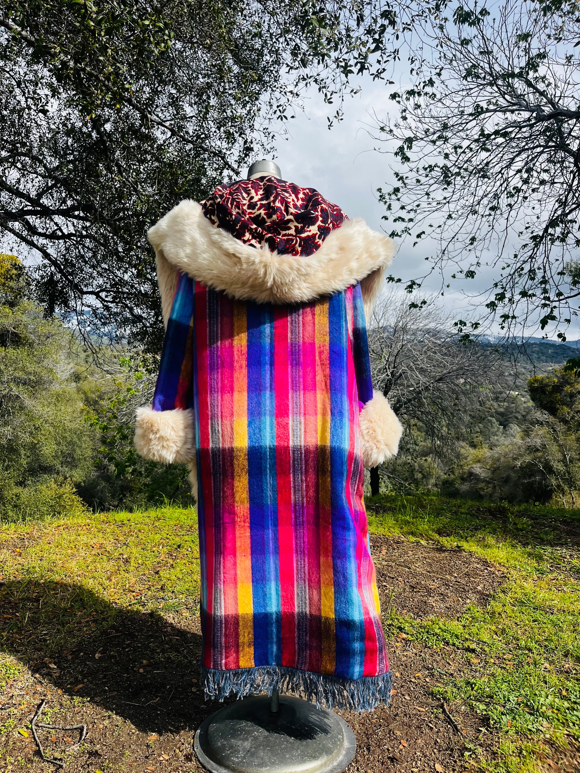 How it’s made The magic begins with finding fabrics that are recycled. This piece is made from dead stock wool from Italy, 1970s wall tapestry, sleves and hood recycled textiles.interior alpaca, hood and trim faux fur All textiles images are hand cut and embroidered. Each piece is made with time and intention. May it serve as a remind of what you are germinating within you.